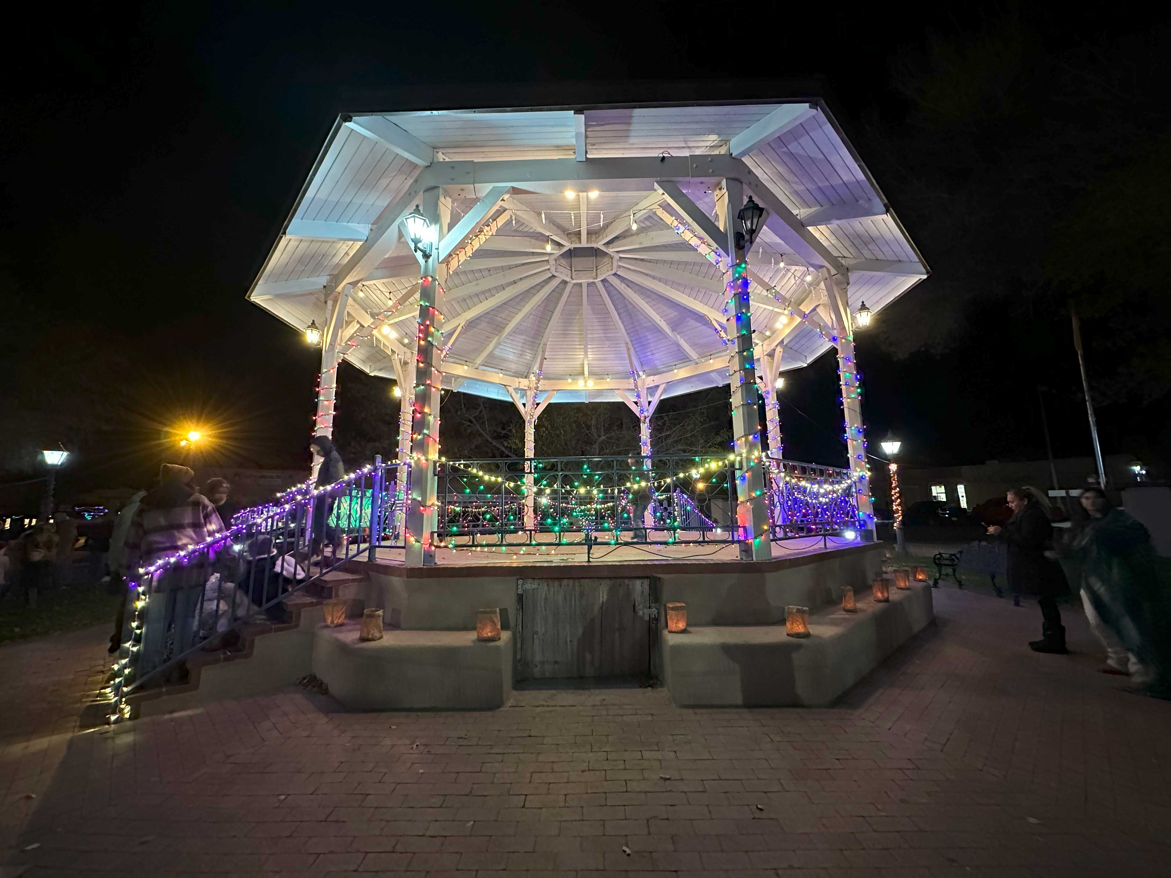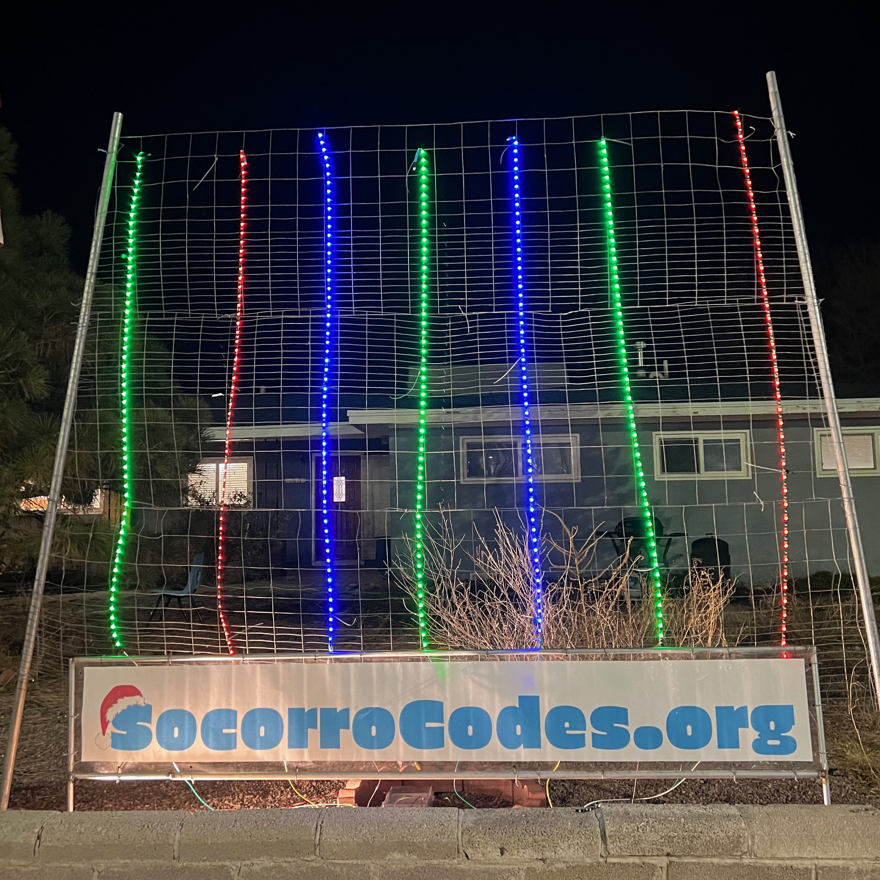 Using 2 control boxes with short range wifi, 16 sections of the Socorro Plaza flashed and danced to the music broadcast over FM.