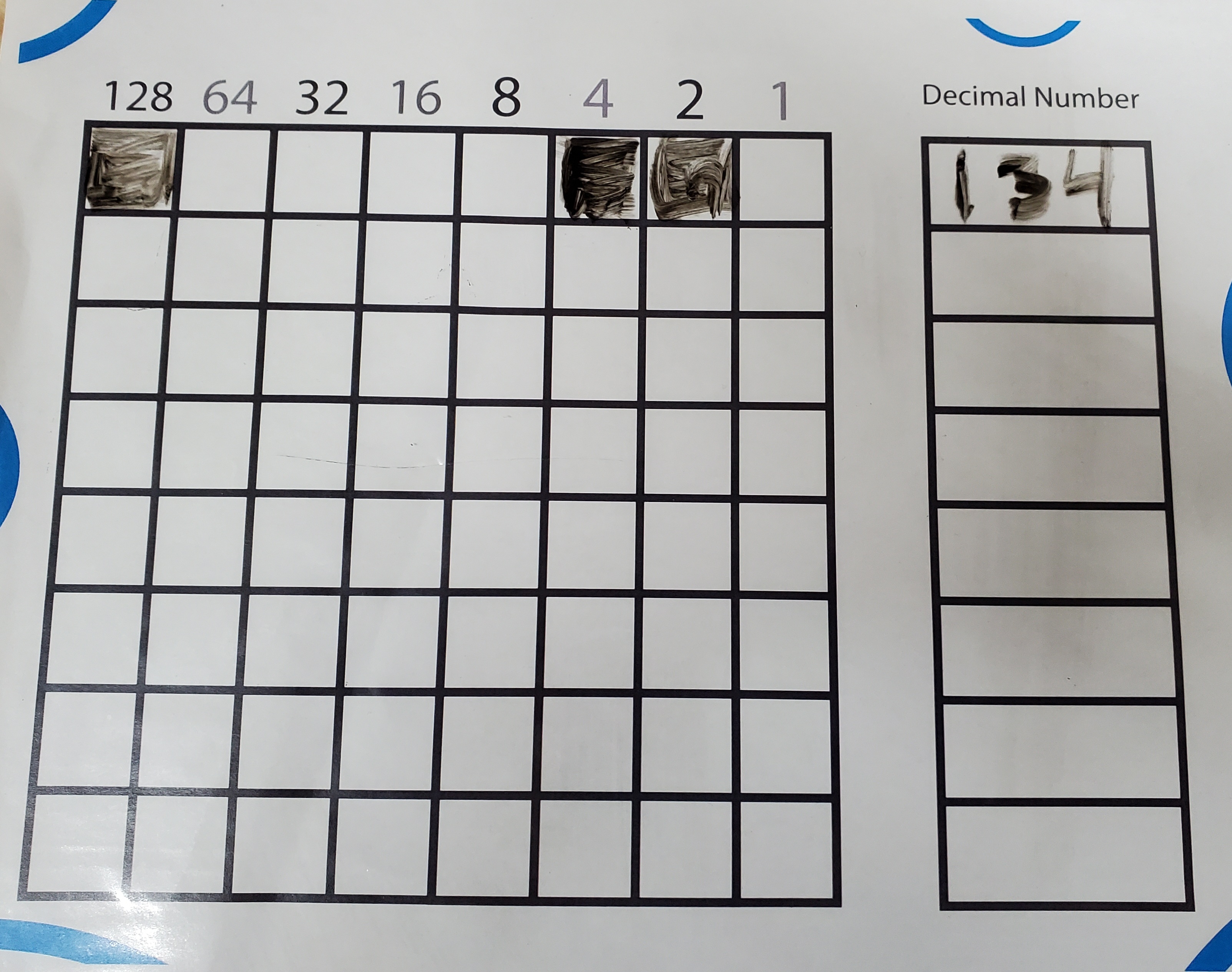 the decimal number they would write down would be 134 (128 + 4 + 2) . When they are done drawing and have converted all the rows into their decimal numbers, they erase the colored-in squares, leaving the decimal numbers intact. They then trade papers with someone else, and using the decimal numbers, convert each row back into its shaded and unshaded boxes, reviving the original art.