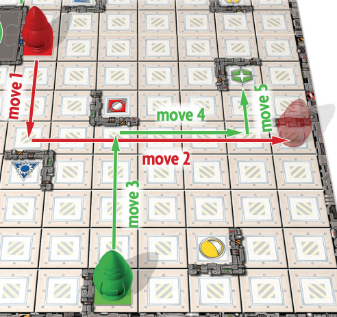 In this game the goal is to get any of the robots (game tokens) to the rainbow colored space on the board. You give the robots inputs by telling them which direction to go (up, down, left, right, but not diagonally) and outputs, by then moving the robot. You can move any of the robots in any order, the catch however, is when a robot moves in a direction, it keeps moving until it hits a boundary or a barrier, then it stops. When crafting your algorithm, try to use as few moves as possible, clarification on counting moves is shown below.